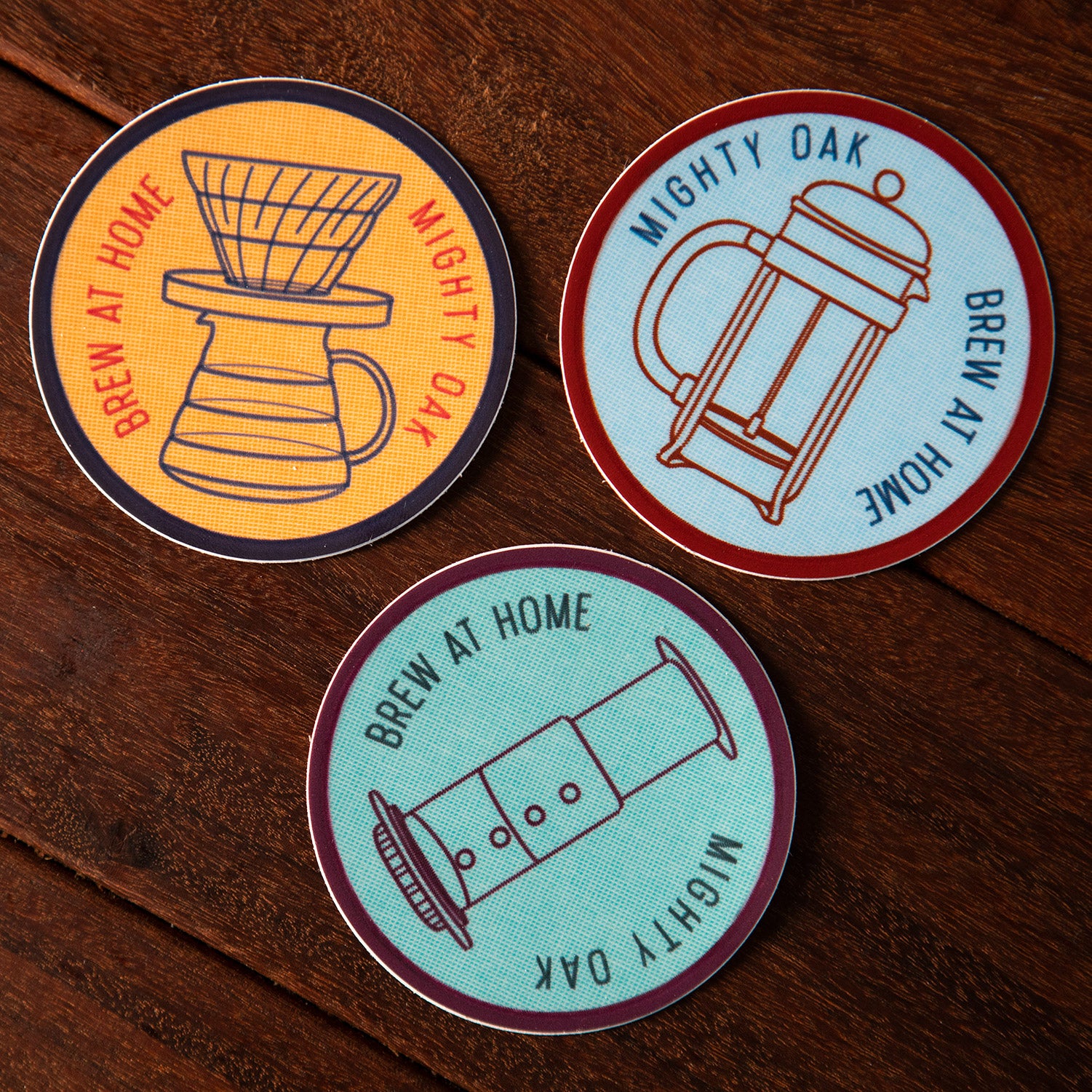 You've stayed home and brewed a lot of coffee this year, so give yourself a merit badge! Our two inch diameter faux-embroidered stickers feature vintage color schemes and your favorite brew methods: pour over, French press, and Aeropress. The retro style is paired with modern durability: these matte finish vinyl stickers stand up to weather, sunlight, and dishwashers.